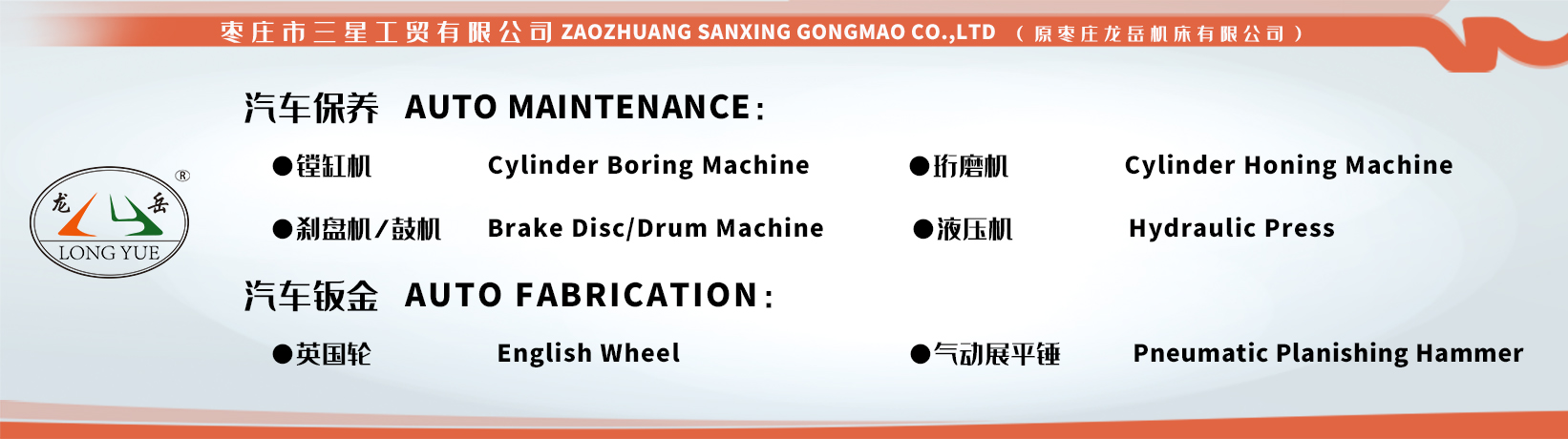 公司专业从事汽保设备的生产已有20余年。销售网络覆盖全国,售后服务体系完善,产品出口东南亚、中东、非洲、德国、南美等国家和地区。现主要产品有:1、T83系列立式制动鼓镗床。2、C93系列卧式制动盘(鼓)车床。3、T80系列IOS/安卓通用版/手机APP入口、珩磨机,4、LTC系列中、大型轮胎拆装机,系列单边举升机,叉式便捷式举升机,侧滑测试仪等汽车保修、检测产品。